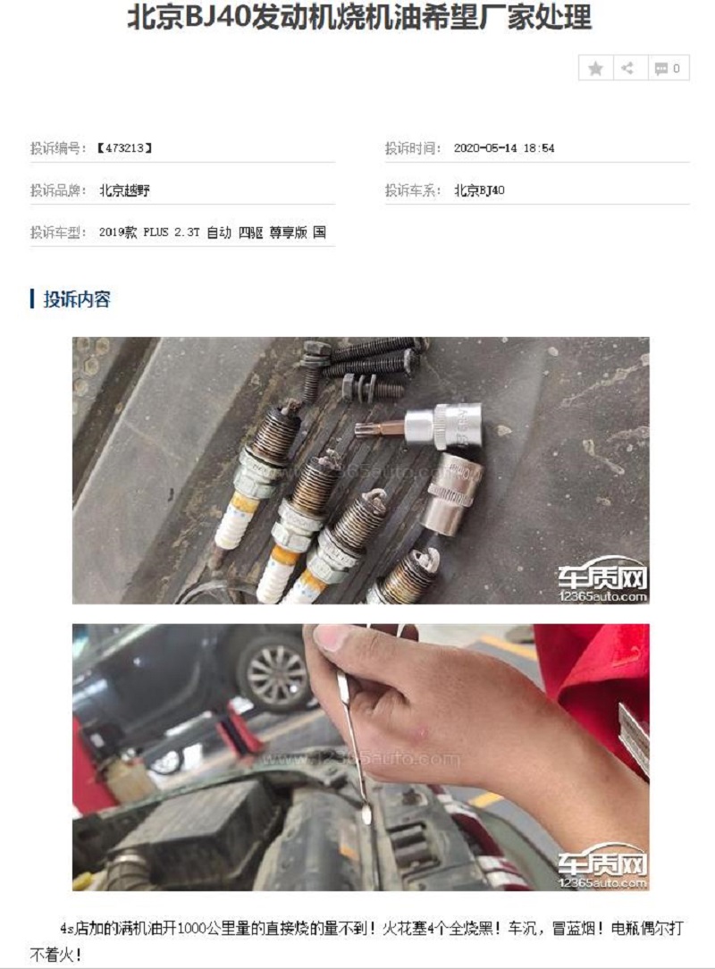 其中消费者投诉最多的问题就是发动机出现抖动、共振、顿挫导致汽车加速无力闯动,其中还有发动机严重烧机油和动力中断等更严重的情况。由此可见集中在同一年款,同一款发动机,同一时间段内出现大量故障发动机,这一定不是偶然现象。不管是发动机生产装配问题,还是发动机存在设计缺陷,都希望北京越野官方能尽快给予答复,出台召回措施。