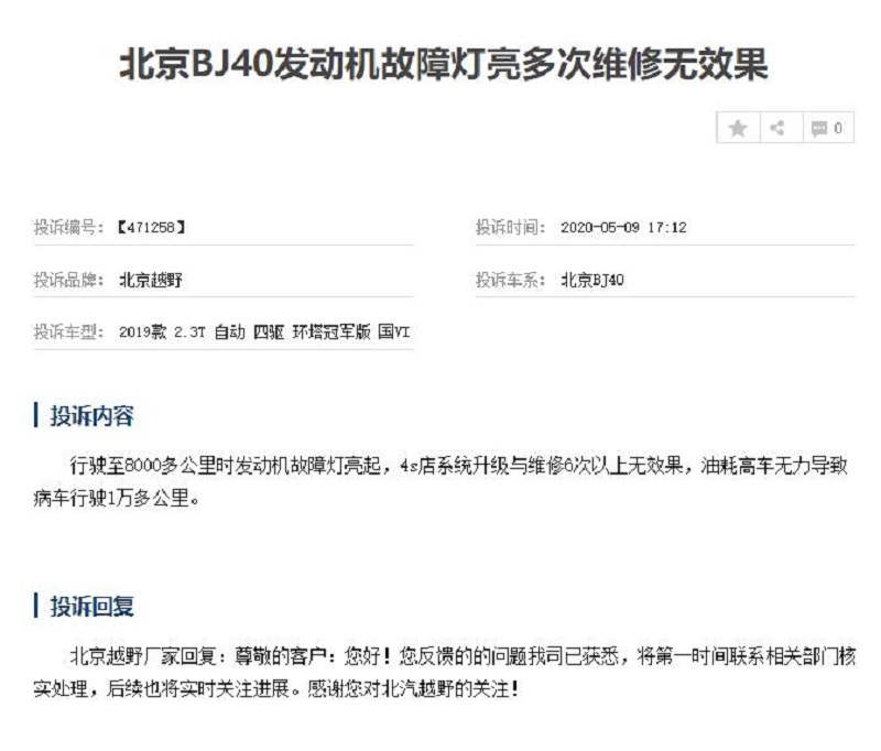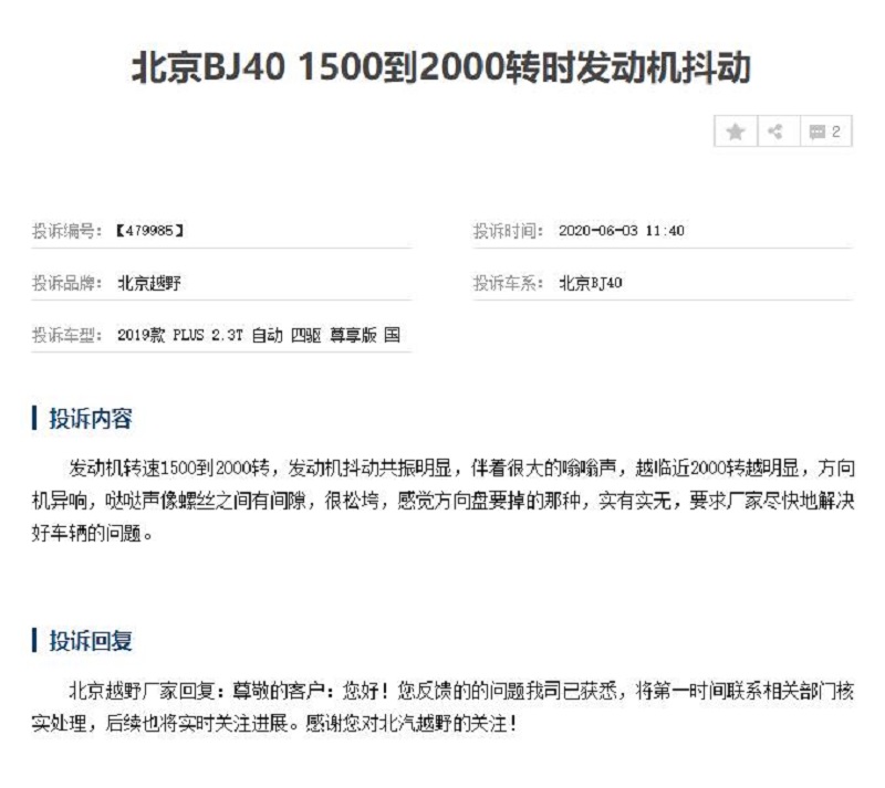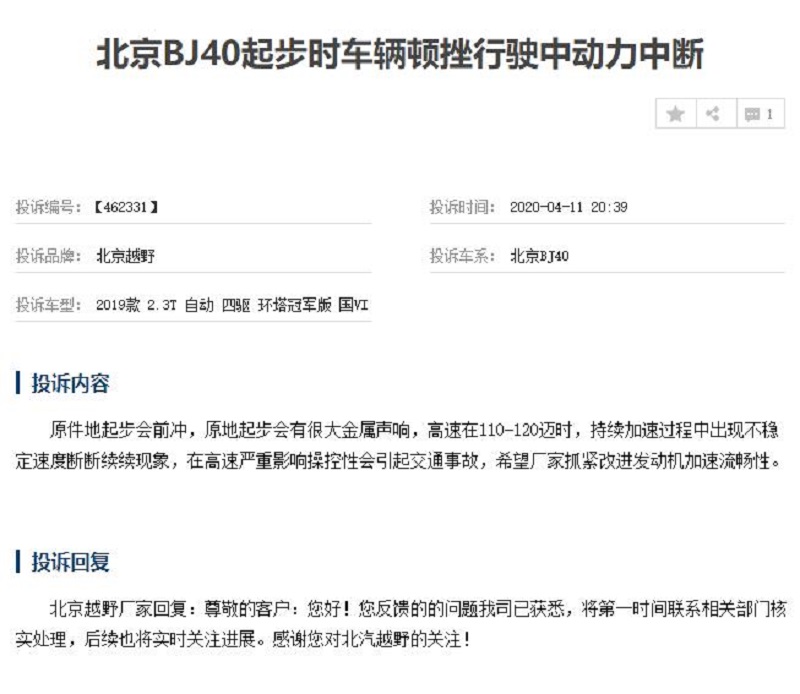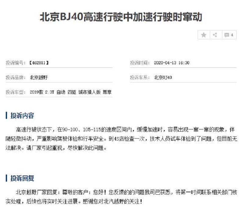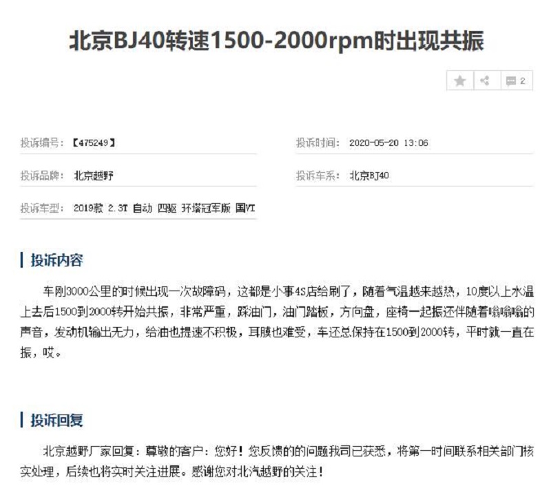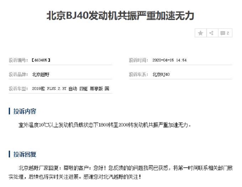 日前,我们从车质网获悉,近期有大量消费者投诉北京BJ40 (配置|询价)发动机出现问题,其中大部分被投诉车型都是2019款BJ40 PLUS 2.3T自动四驱车型。