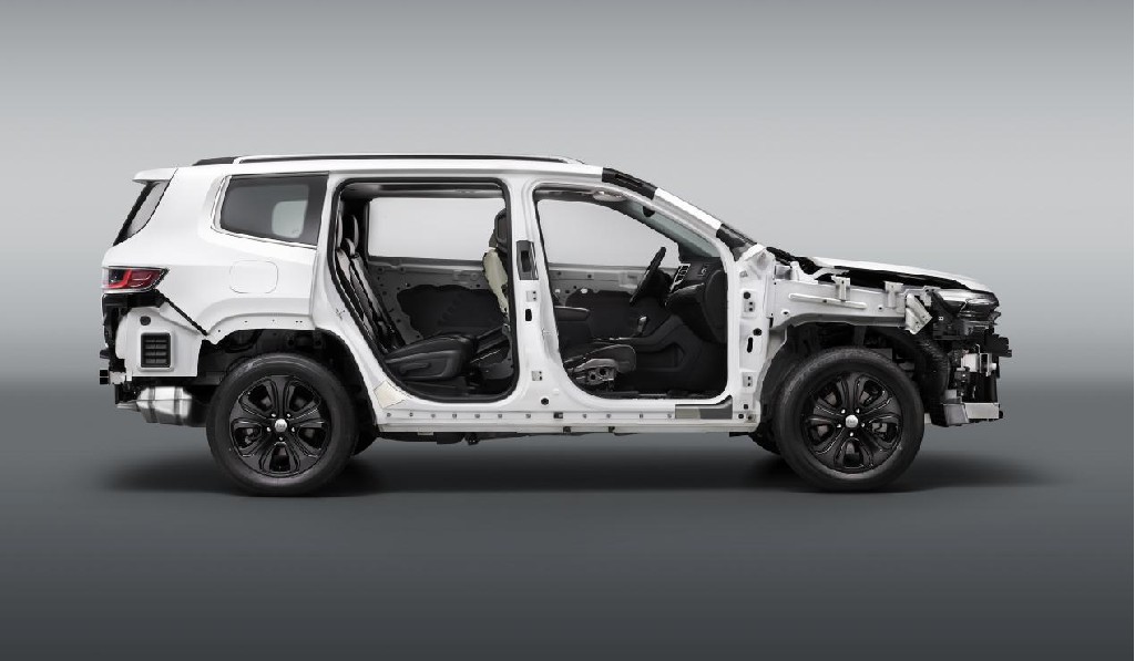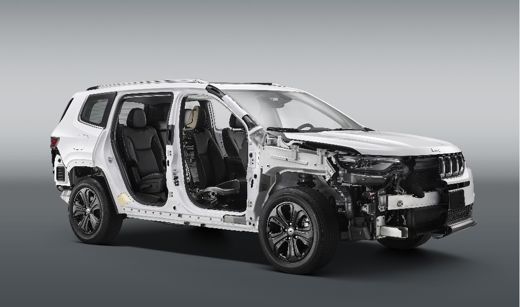 首先在车身强度上,Jeep选用的是热成型钢材,强度是普通钢材的3-4倍。大指挥官的AB柱和顶棚等部位都采用了热成型钢,双层近4毫米厚,它也是德国本特勒在中国供应的最厚材料,强度高达潜艇级的1350Mpa。