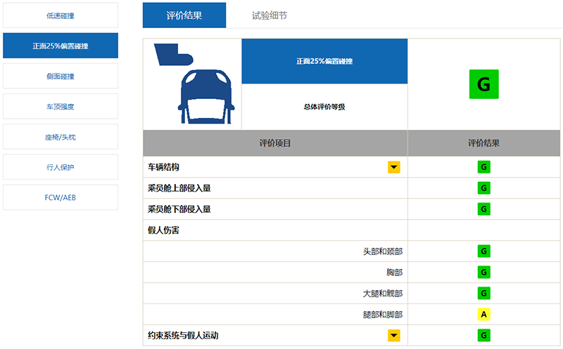 在该项碰撞测试细分项目上,车辆结构、乘员舱上部侵入量、乘员舱下部侵入量、假人头部和颈部、假人胸部、假人假人大腿和髋部、约束系统与假人运动均为“优秀”,假人腿部和脚部成绩为“良好”。