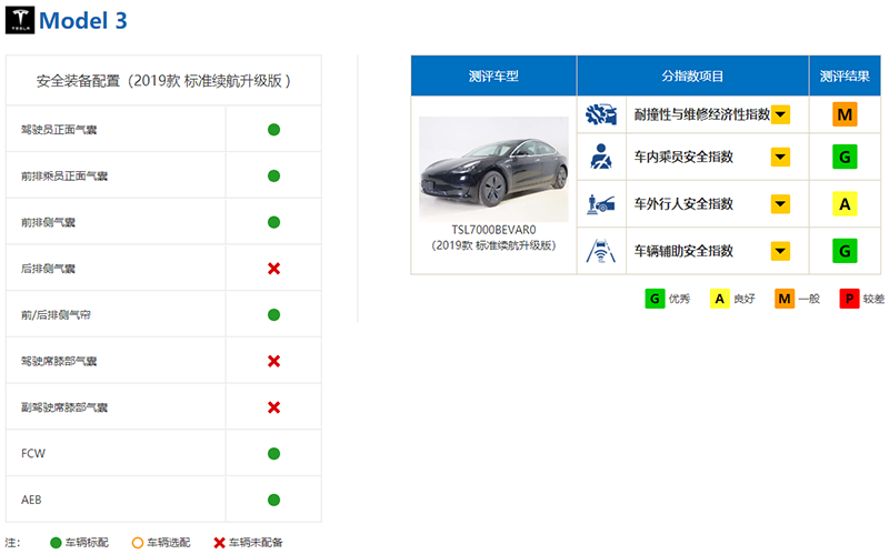 日前,中保研公布了国产特斯拉Model 3 (配置|询价)的碰撞测试结果。在“耐撞性与维修经济性指数”项目获得一般评价(M),在车内成员安全指数上获得了优秀(G),而在车外行人安全指数获得良好(A),车辆辅助安全指数上获得了优秀(G)。