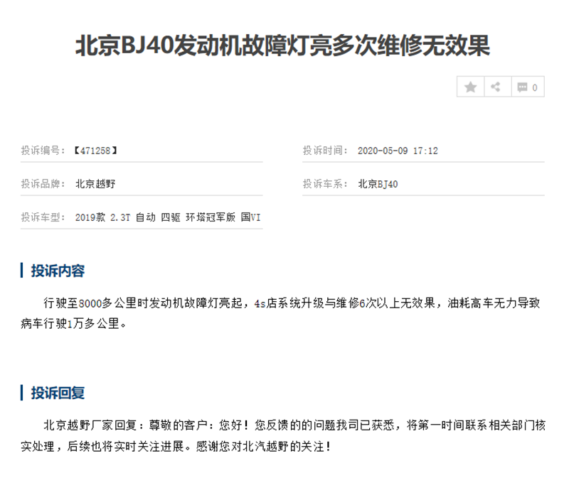 还有车主投诉2019款2.3T 自动四驱环塔冠军版国VI,发动机故障灯亮,多次维修无效果。行驶至8000多公里时发动机故障灯亮起,4s店系统升级与维修6次以上无效果,油耗高车无力导致病车行驶1万多公里。