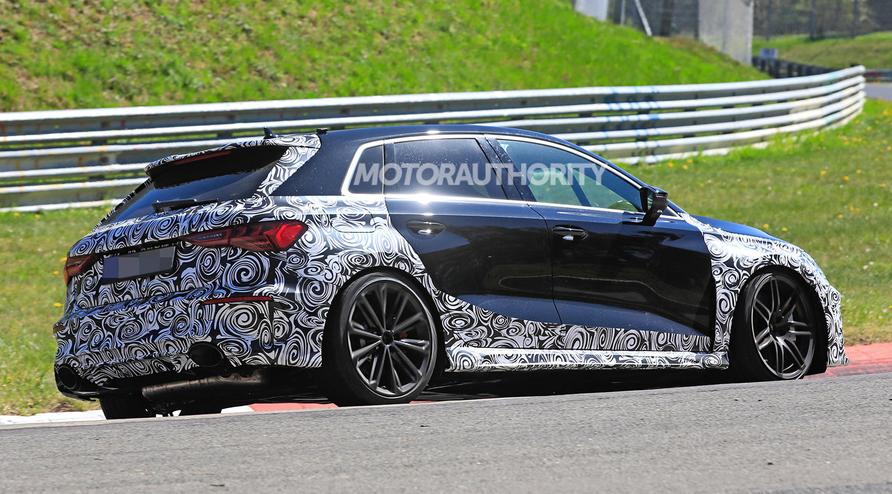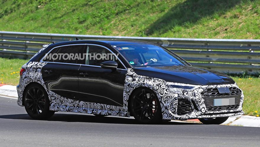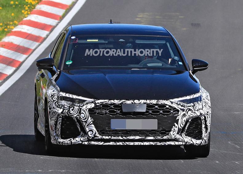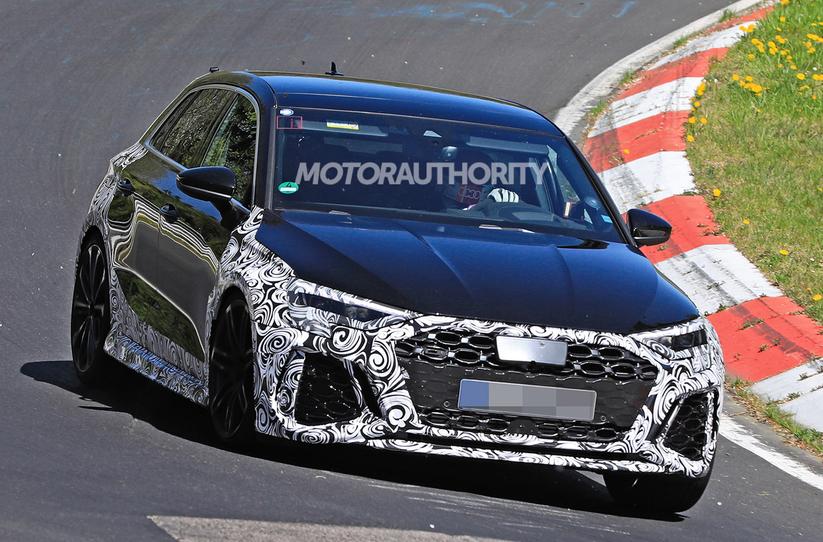 全新奥迪RS3 Sportback谍照曝光,P版车型可达450马力。近日,有外媒曝光了一组全新奥迪RS3 Sportback的测试谍照。虽然新车车身细节部位覆盖了伪装贴纸,但仍可看出全新RS3采用了面积更大的六边形前格栅,内部为黑色蜂窝状中网,下包围两侧的开孔可以为刹车系统提供更强的散热。动力方面,新车将搭载一台升级后的2.5T涡轮增压发动机,最大功率420马力,峰值扭矩500牛·米,并配有quattro全轮驱动系统。此外,Performance版本车型最大功率有望达到450马力。