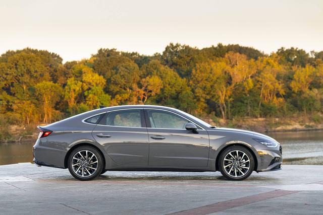 再来看一下即将上市的第十代北京现代索纳塔,外观部分,前脸部分采用大尺寸进气格栅,搭配贯穿式的下进气口,凸显运动气息。LED日行灯带采用隐藏式设计,与镀铬饰条融为一体并向后延伸,更具辨识度。车身侧面,一条修长的腰线贯穿整个车身,降低了视觉重心,有一种跑车的既视感。车身尺寸分别为4955/1860/1450mm,轴距2890mm。