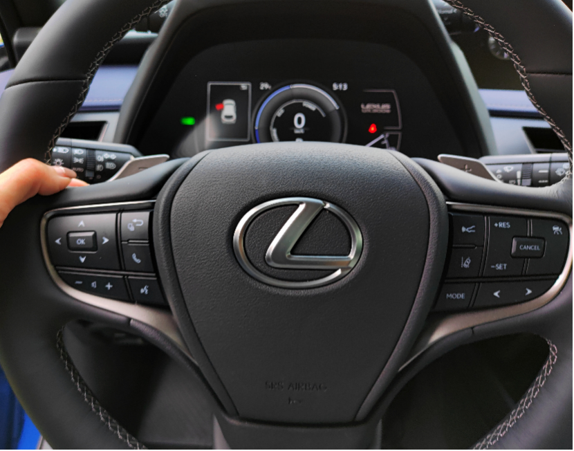 内饰换了电子挡杆,跟LS (配置|询价)一样。方向盘两边的换挡拨片是来调节能量回收的,一般的纯电动车能量回收有两挡或者三挡,但UX 300e有四个挡,方便你的驾驶习惯,我是喜欢拖拽感的,至少少踩刹车了,哈哈哈哈哈,我懒。
