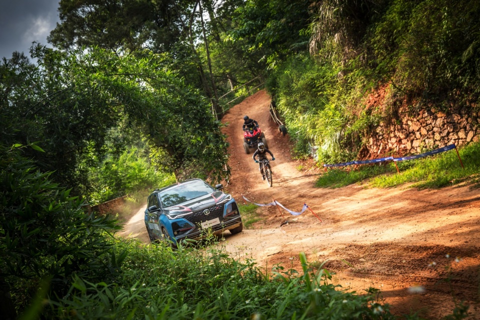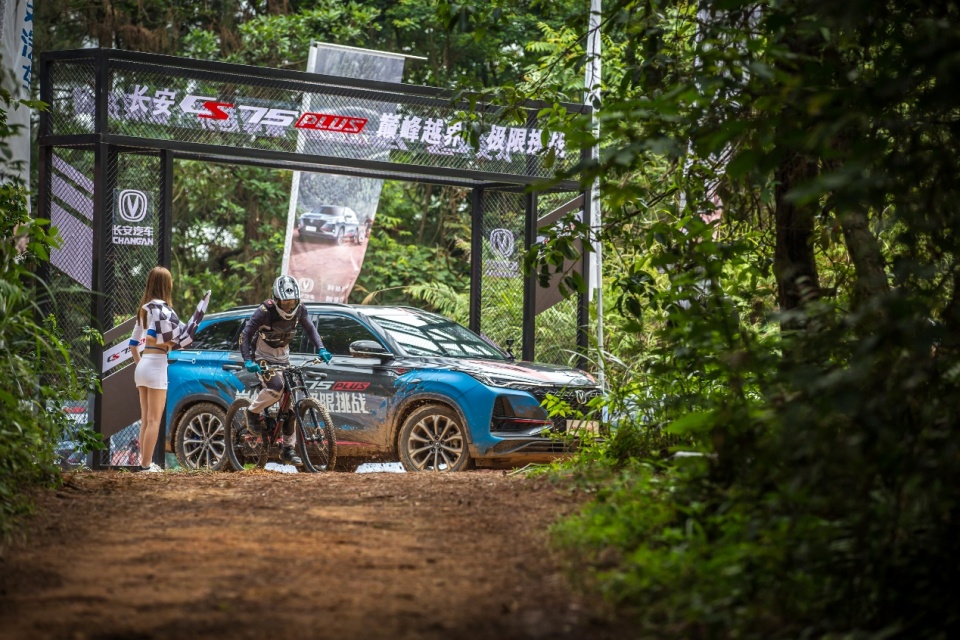 下午2点,随着发令枪一声枪响,CS75PLUS和山地车同时发车。虽然两者赛道不同,但都将面临艰险挑战。据介绍,此次比赛山地自行车赛道全长2公里,整体落差同样约为230米。按照目前国内最快的自行车手竞赛平均时速31.765km/h,跑完全程至少需要约3分30秒。相比3.5公里的汽车赛道少了1.5公里,走线也更直,CS75PLUS想要PK成功,难度可想而知。