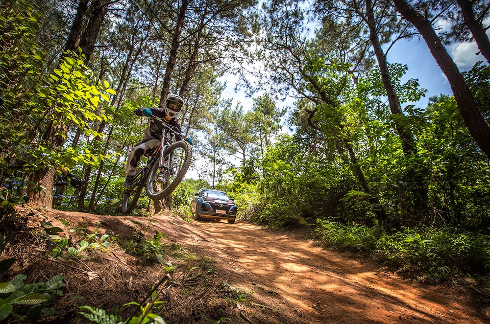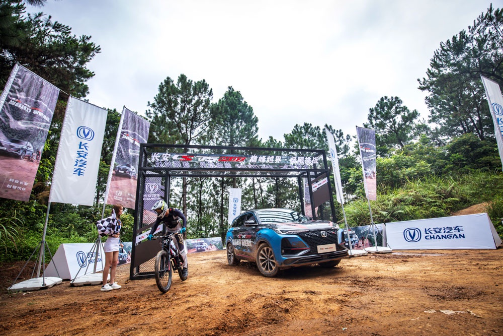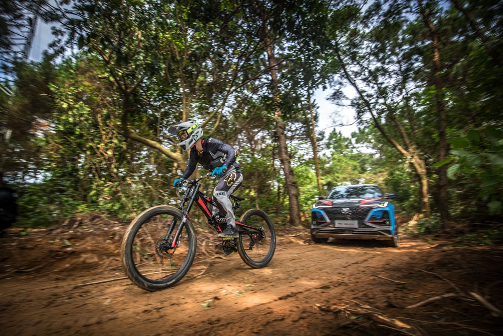 6月10日 ,广西芦仙山,一场“不公平”的较量正在进行。赛车圈知名特技女车手华婷婷刚刚驾驶一辆CS75PLUS (配置|询价)驶离出发点,一旁严阵以待的山地自行车速降大神李显一,便迫不及待地踏上自己的爱车一头扎入了赛道。