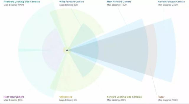 其中主视野摄像头:范围可达150米,视野能覆盖大部分交通场景。