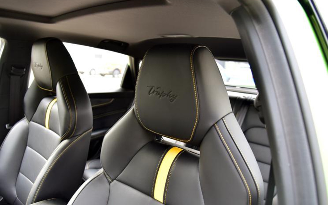 内饰上,新车整体以黑色为主,挡把区域加入了黄色饰条进行妆点,看着还是蛮时尚的。方向盘上采用了Super Sport的红色按键,做法与法拉利类似,看着挺战斗的。配置上,新车将搭载12.3英寸全液晶高清仪表、10.1英寸IPS中控屏(多屏联动+语音操控)、无线充电、电子手刹、电子驻车等功能。此外,新车还提供运动声浪功能,切换到Super Sport模式时,中控还有专属的车辆信息显示,很有性能范。