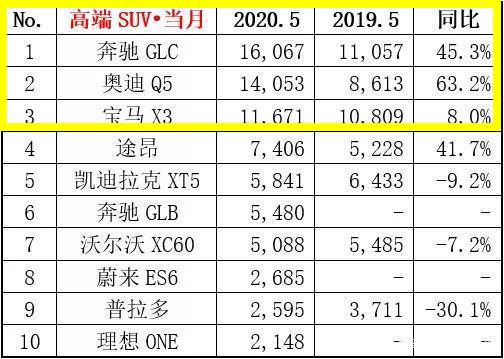看到销量数据,5月高端SUV销量第一名是奔驰GLC (配置|询价),卖出16067辆,同比去年增长45.3%。第二名是奥迪Q5,卖出14053辆,同比去年增长63.2%。第三名是宝马X3 (配置|询价),卖出11671辆,同比去年增长8.0%。而来到第四名,销量数据则急剧下滑,它来自大众旗下的途昂车型,指导价比前面的BBA车型更低,可销量却只有区区7406台,前后之间差距甚远。