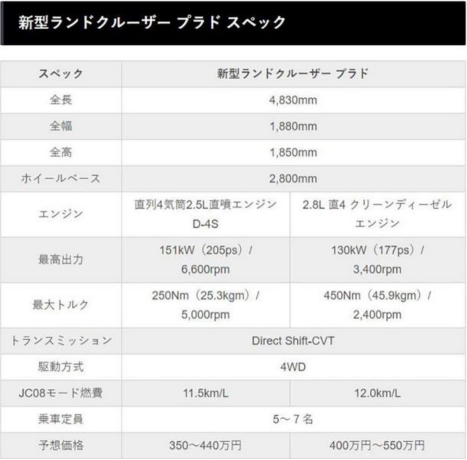 其实这一代3.5L分时四驱的普拉多就已经被挤兑的够呛了,不过好在是个V6发动机,对于只求保值不求越野的朋友来说,也有很多可取之处。不过这个局势很快也就消失了,因为有一张可信度极高的配置表从日本传出来了,当中写得明明白白,2.5L直列四缸。