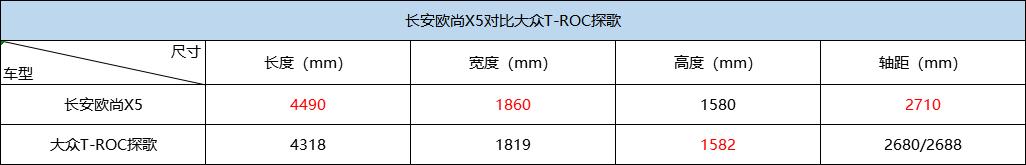 从车身尺寸方面看,欧尚X5在车身长度、宽度与轴距方面优于大众探歌,这意味着它的车内空间会有更好的表现。