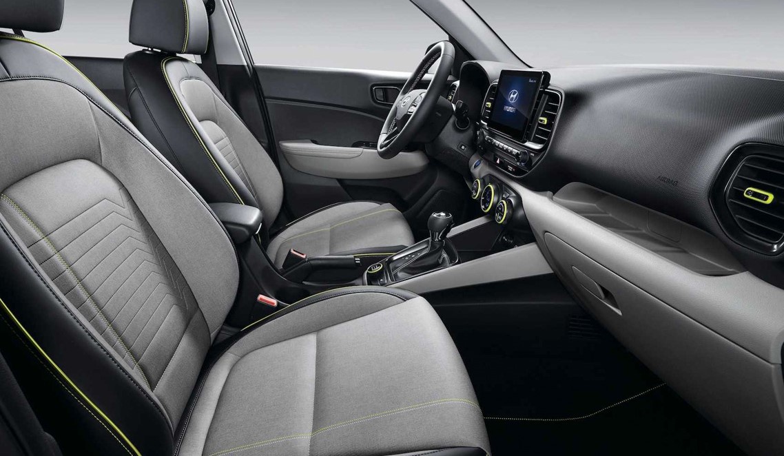 内饰方面,现代Venue Flux采用了黑色系为主的内饰设计,大尺寸液晶中控显示屏搭配三辐式多功能方向盘,增添了科技感。车门侧面以及中空台包裹有米灰色软性材料,提升了内饰质感。并且在座椅缝线以及空调区域都点缀有荧光绿色饰件。