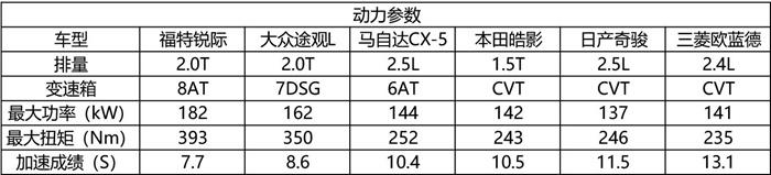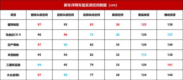 乘坐空间排名:福特锐际>日产奇骏≥三菱欧蓝德≥本田皓影≥大众途观L>马自达CX-5