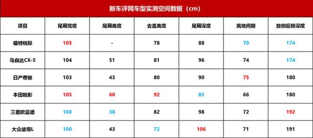 尾厢空间排名:大众途观L>本田皓影>三菱欧蓝德>马自达CX-5=日产奇骏=福特锐际