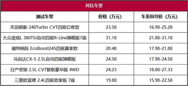 可能大家也注意到了,这个级别中一个非常重要的品牌——丰田,缺席了。其实为了找丰田,我们也想尽了一切办法租车、借车,但因为RAV4和汉兰达都太新了,租车平台上都没有这两款车;厂家试驾车也因为档期的原因,无法参与,最终丰田就只能遗憾地缺席了。希望下次有车的时候,我们能再拿RAV4或威兰达参与此类对比。