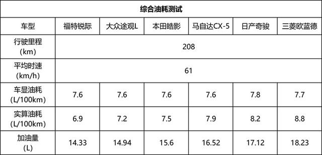 如图所示,本次油耗测试排名为:锐际>途观L>皓影>CX-5>奇骏>欧蓝德。但要说明的是,本次对比测试因为时间较赶,我们并未用传统的油耗测试路线及测试方法,而是采用大家一起从A点开到B点,计算全程实际油耗的方法。这次测试虽然涵盖了部分市区路况,但整个路程都较为通畅,平均达到时速61km/h,总路程为208km,实测油耗如下表所示。说一下我们的几点大结论: