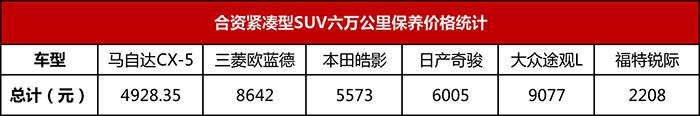 后期保养维护经济性排行:福特锐际>马自达CX-5>本田皓影>日产奇骏>三菱欧蓝德>大众途观L