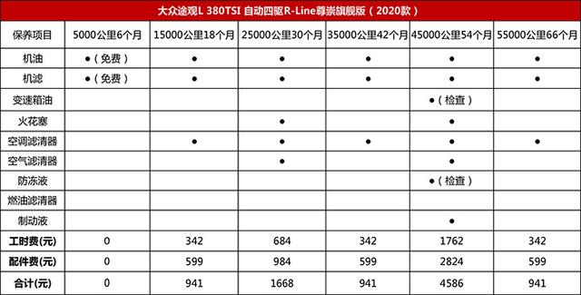大众途观L的保养费用无疑是6台车中最贵的,它也是6台车中唯一一台需要在六万公里内更换两次火花塞的车型。不过在45000公里时,防冻液和变速箱油都只是视乎情况来决定更换,假设检查结果乐观,那途观L的总保养价格能降低一些。不过就总体而言,途观L的保养费用依旧偏贵。