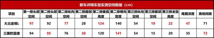 和同样是七座车的三菱欧蓝德相比,大众途观L七座版的第二排空间受第三排的影响就比较明显了,尤其是纵向空间方面。从上表可以看到,五座状态下的七座版途观L第二排纵向空间、腿部空间“缩水”严重,只比后排空间表现最小的马自达CX-5略微多点,妥协得很明显。