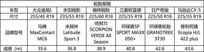 本次刹车成绩排名为:途观L>皓影>锐际>欧蓝德>奇骏>CX-5,本次排名也可以简单地概括出两点: