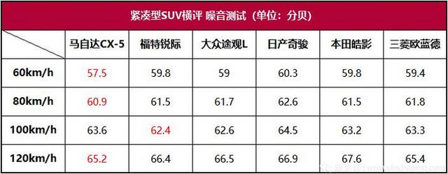 车厢静谧性水平:马自达CX-5>福特锐际>大众途观L>日产奇骏>本田皓影>三菱欧蓝德