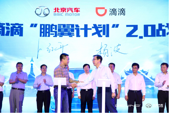 北汽营销公司副总经理卜红升与滴滴出行高级总监杨波签署合作协议,开启鹏翼计划2.0