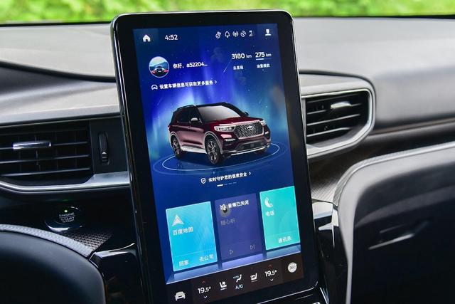 内饰最重要的一个部分就是中间这块全系标配的12.8英寸触控大屏,内置SYNC+智行信息娱乐系统,这是由长安福特专为国内市场开发的车机系统,不论是尺寸还是功能的兼容性上都要好过海外版上的那块小屏幕,具备丰富的娱乐功能与实用性,同时整套车机系统也具备OTA在线升级。