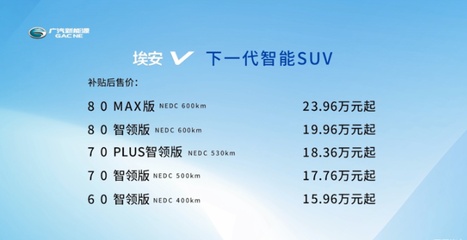 提及广汽新能源,了解它的朋友想必都知道该品牌的"安"家族,继推出了Aion S (配置|询价)和Aion LX (配置|询价)之后,市场反应非常良好。这次广汽新能源又为我们带来了一款全新车型——Aion V (配置|询价),目前新车已经正式上市,定位于紧凑级纯电SUV,全系共5款配置车型,补贴后的售价区间为15.96~23.96万元。