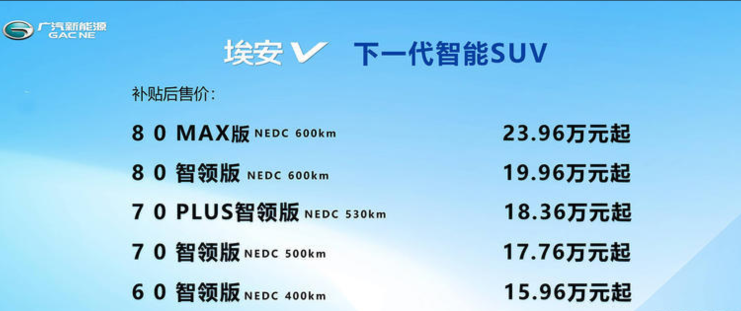 广汽新能源古惠南总经理在发布会上揭晓了埃安V (配置|询价) 5款配置车型的售价,包括60智领版、70智领版、70 Plus智领版、80智领版和80 MAX版,补贴后售价为在15.96-23.96万元。即日起,广汽新能源埃安V正式交付,同时用户可体验到“埃安一键尊享服务”等。