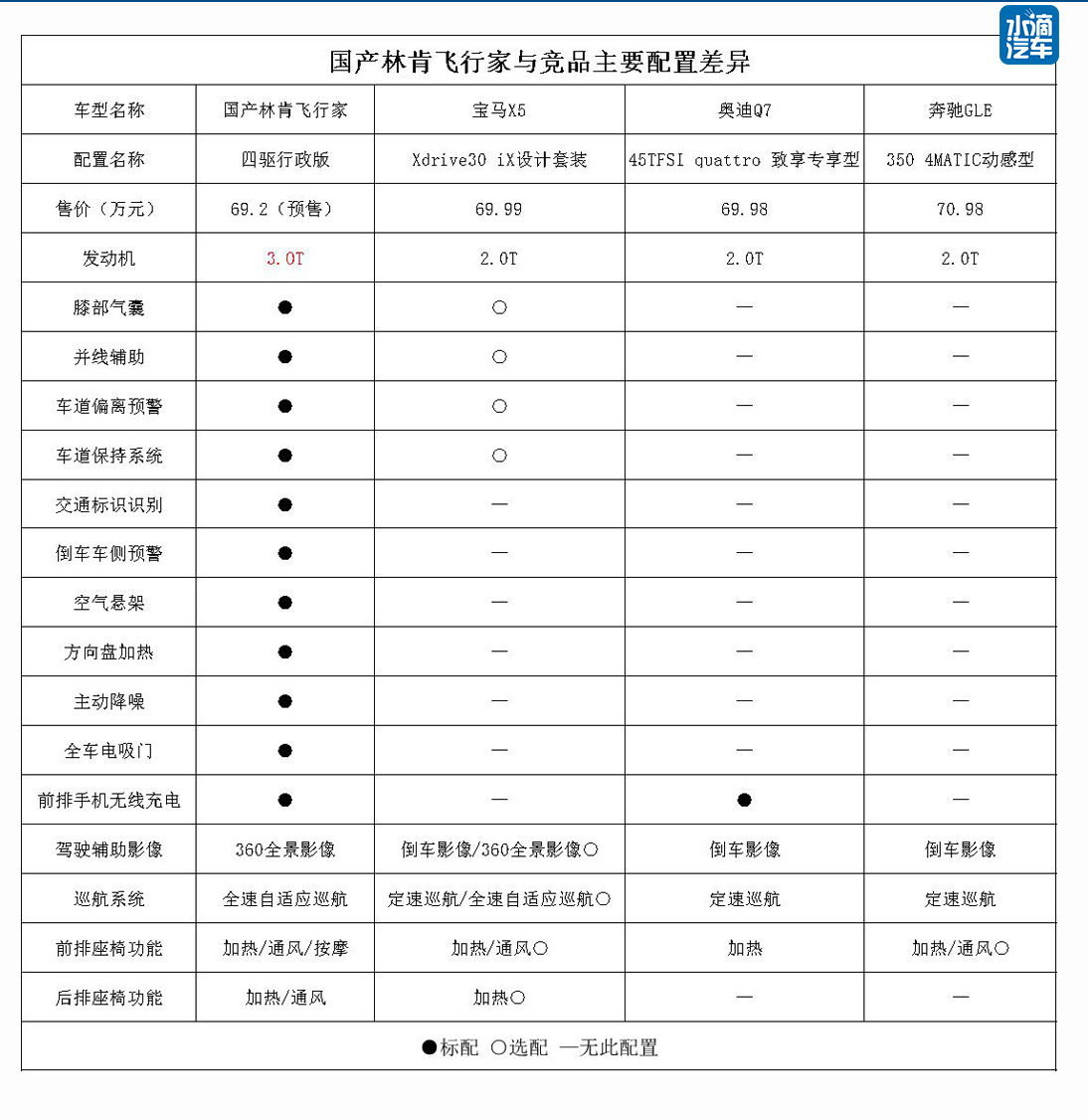面对德系三杰,长安林肯飞行家将采用什么战术呢,笔者为大家分析一下。首先是价格方面,经过梳理可以看出,全系搭载3.0T引擎的飞行家要比宝马X5、奔驰GLE和奥迪Q7的2.0T车型还要便宜,价格优势明显。