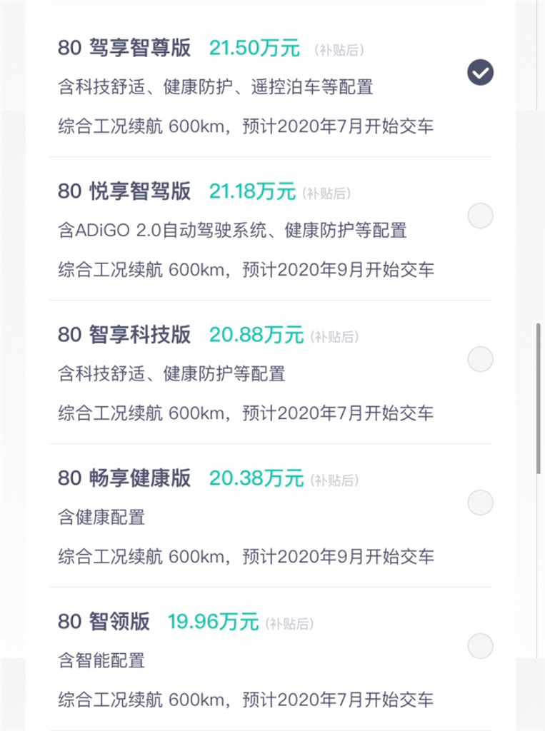 此外,在畅享健康版车型的基础上,再增加ADiGO自动驾驶系统及全新一代iBooster电控助力制动系统,打造出悦享智驾版车型。另外也特别在智享科技版车型的基础上,通过增加一键遥控泊车套装及全新一代iBooster电控助力制动系统,打造出驾享智尊版车型。