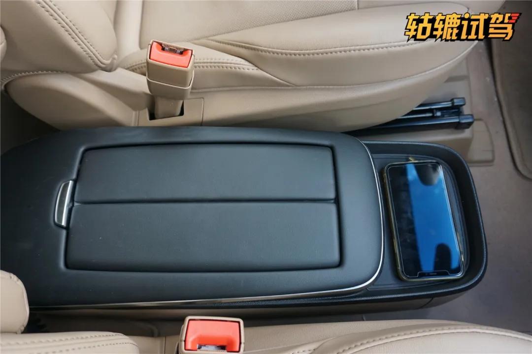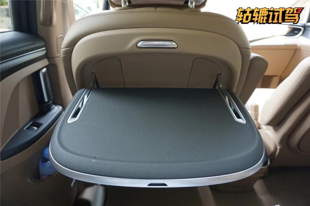 要是想办公,打开前面的小桌板,这个阻尼和GL8 艾维亚六座版的一样平顺,且有哑光镀铬饰条进行装饰,桌面的打孔皮质让防滑功能进一步加强。