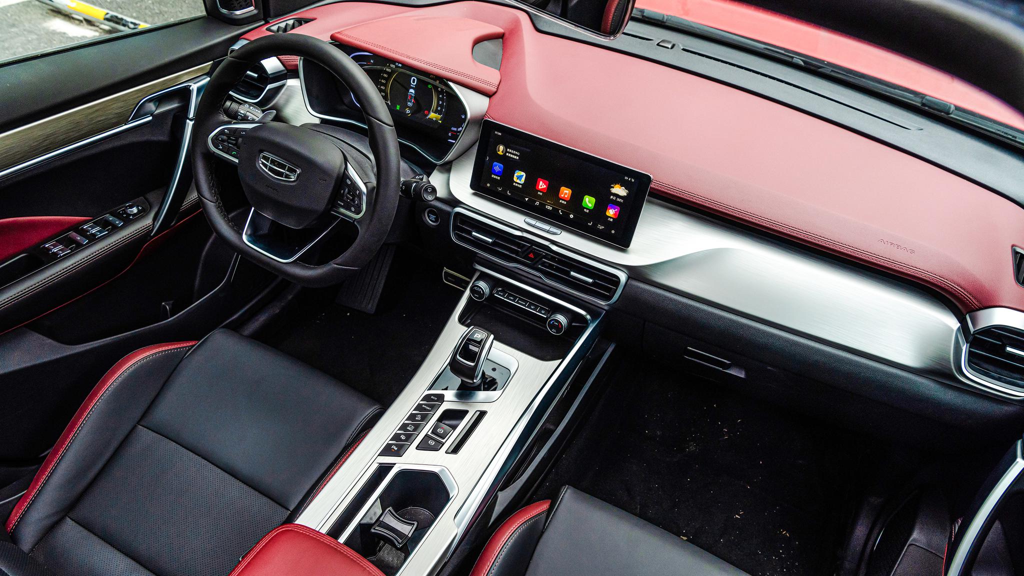 超大长宽比的中控屏幕显得格外精致,而平底的方向盘又凸显了运动氛围。当然,方向盘上的吉利Logo也“运动味”进行了黑化处理,而后方更是用金属质感的换挡拨片作为点缀。