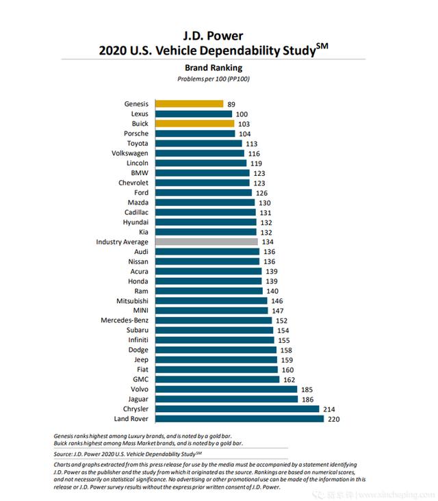 今天这个瓜是属于后者,最近那家很出名的J.D. Power放出了2020美国车辆可靠性研究的报告,虽然这是一份美国本土车辆的研究,跟国内车型是不太一样的,但是国际品牌在全球各个市场的调性都是比较接近的,作为参考并无不可。