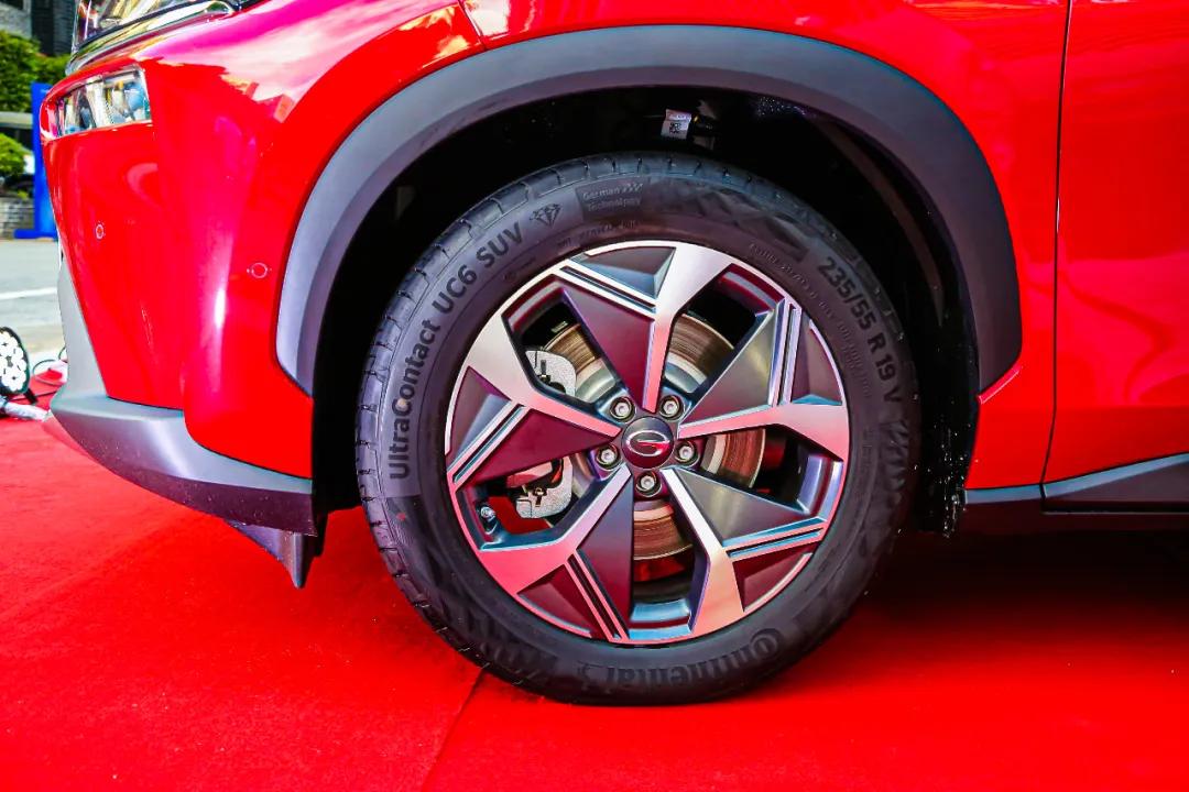 车身侧面的贯穿设计连接了头灯和尾灯,埃安V配备了多种尺寸和造型的轮毂,其中19寸轮毂有“镭射星轮”和“原石星轮”,20寸轮毂有“机桨星轮”,都具有很强的未来感。