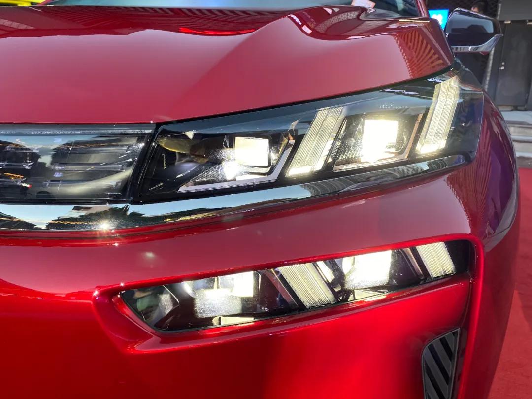 埃安V的分体式LED前大灯十分锐利,点亮后显示效果十分出色,并且上下灯组通过贯穿LOGO的饰条切割,还营造出“水天相接”的设计效果。