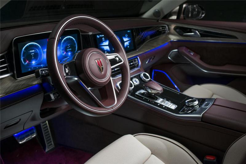 在部分细节方面,以红旗旗标为延展中轴线的设计,和外观中轴线的设计灵感堪称一本同源,其背后的文化都缘自故宫的中轴线,再辅以柔和线条,诠释出“浩雅中正”之美,为用户带来视觉享受与心灵感悟双重叠加的审美效果和体验。