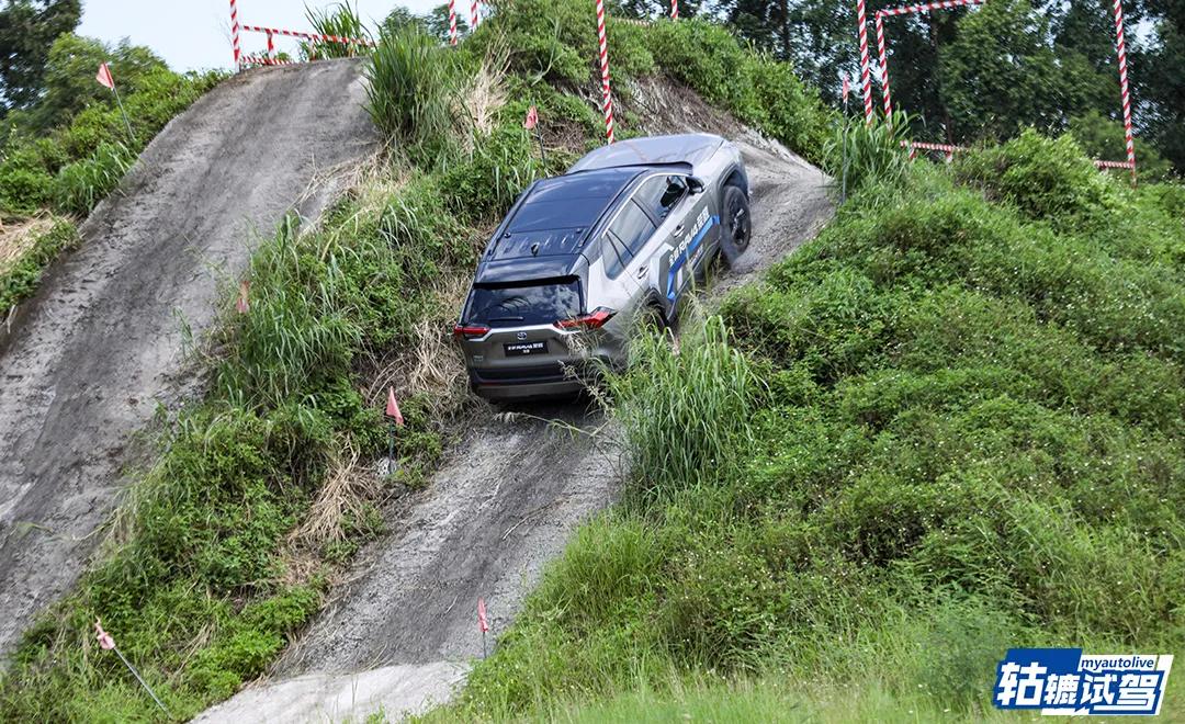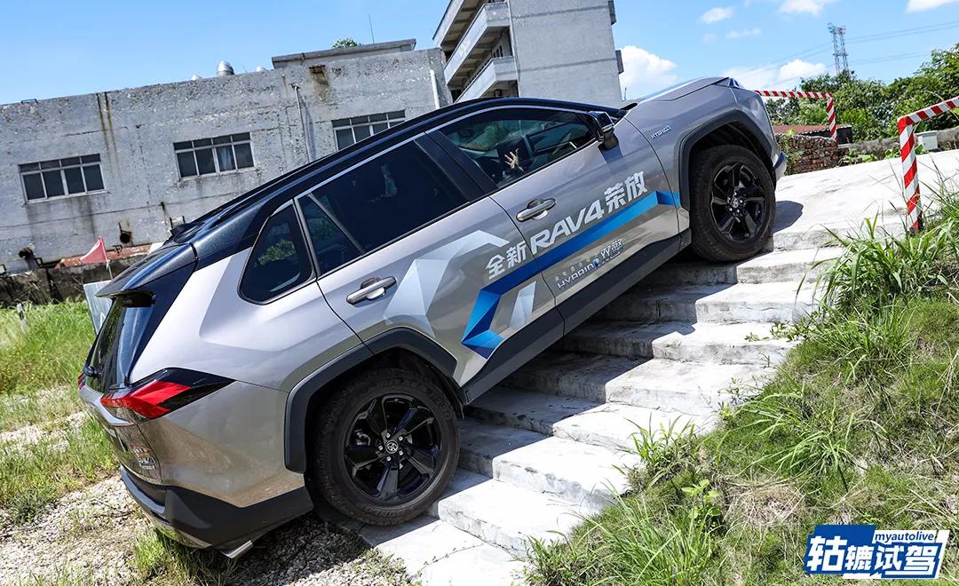 虽然这次是模拟越野场地,但还是有板有眼的,阶梯路、起伏路、碎石路、右侧坡和驼峰桥等九大个越野的模拟场景,让轱辘哥体验了一把荣放双擎的越野能力。虽然没有差速锁,但得益于后桥拥有电机驱动,应对这些模拟的越野场景还是比较轻松的。