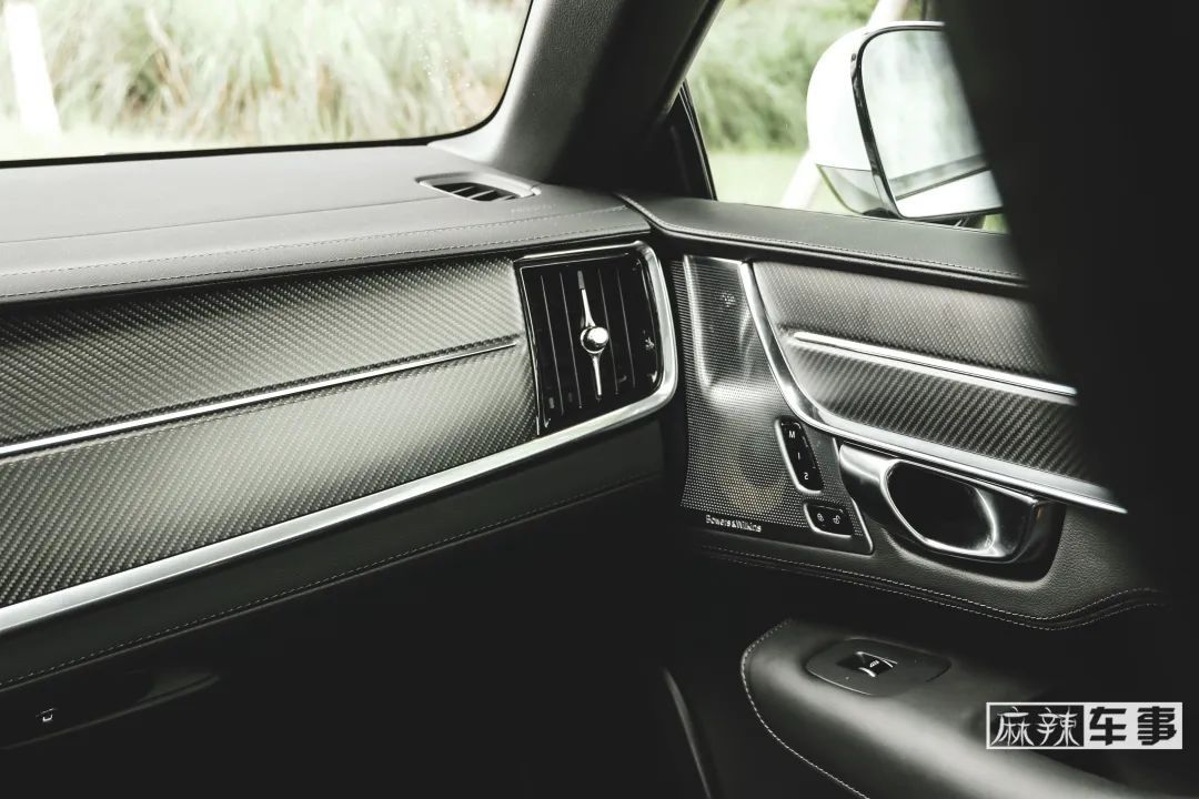 它和沃尔沃S90最大的不同就是从中控台上延伸出的碳纤维面板,底部辅以镀铬饰条,勾勒出内部座舱的轮廓。除了碳纤维材质,带有缝线的皮革包裹也出现在车内,例如方向盘、门板等能触碰到的地方都有,手感细腻,触感较好。