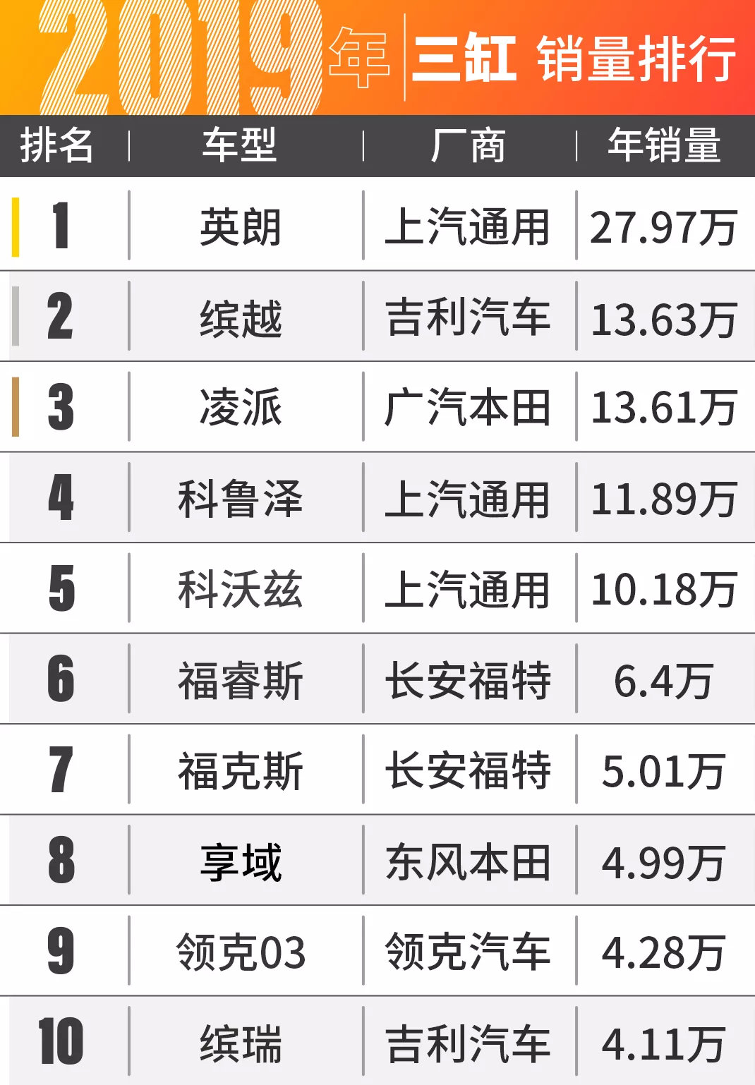 发动机无疑是消费者在买车时着重考核的项目之一,可在小排量当道的今天,消费者对发动机最在意的点,也逐渐从原来的动力、油耗转移到了发动机的气缸数上。其中,“谈三缸色变”早已是一件人尽皆知的事了。那使用三缸发动机的车型就一定销量惨淡吗?又有哪些三缸车型是其中的佼佼者呢?今天我们就通过2019年三缸车销量排行榜来一探究竟!