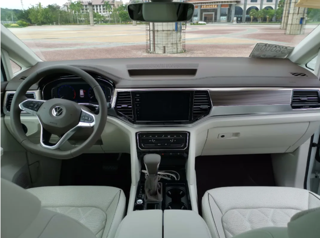 威然内部采用的是2+2+3的七座座椅布局。中控台布局简洁大气,线条运用得干脆利落,有着浓厚的大众家族设计味道。米、棕色双拼辅以木纹点缀的搭配,更显稳重感。