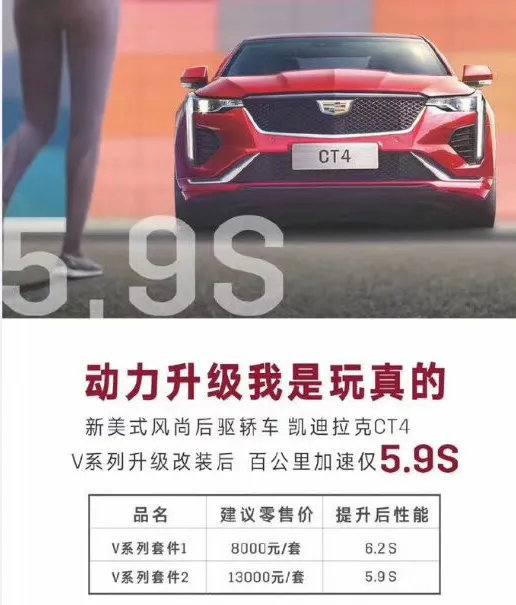 最近,一张凯迪拉克经销商的宣传海报引起了大家的关注,内容的核心就是凯迪拉克针对CT4推出了原厂改装套件,仅需8000元就能将CT4的0-100km/h加速从6.9秒提升至6.2秒,与上一代ATS看齐。如果花13000元的话,则能进一步将它的加速能力提升至5.9秒,与四驱钢炮领克03+达到了同一水平。