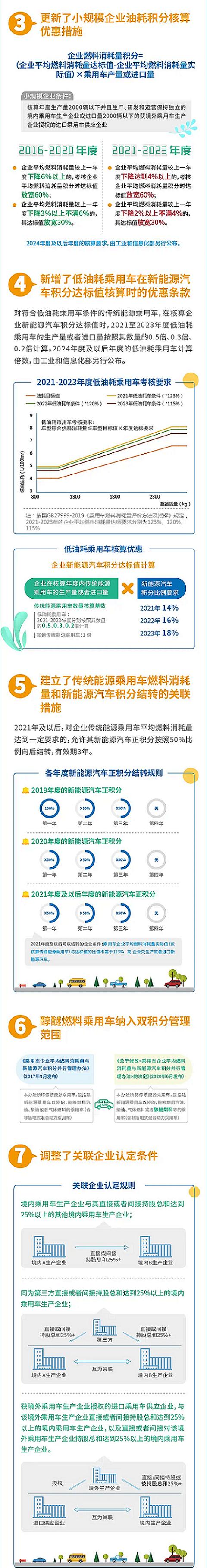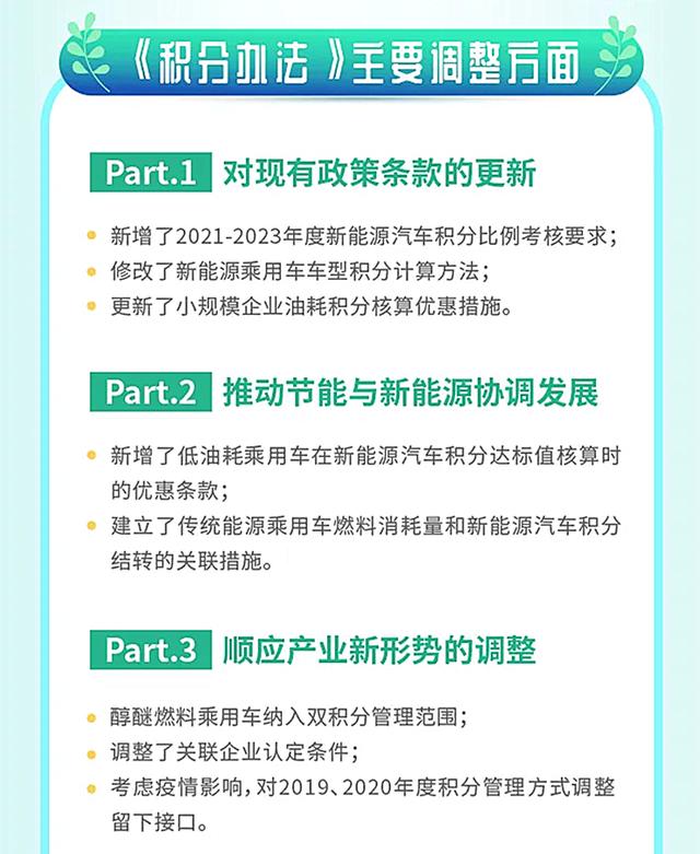 第三部分则主要是为了顺应产业新形势的调整,主要内容分为以下三点,第一是将醇醚燃料乘用车纳入双积分管理范围;第二是调整了关联企业的认定条件;第三则是考虑到了新冠疫情影响,对2019、2020年度积分管理方式调整留下借口。
