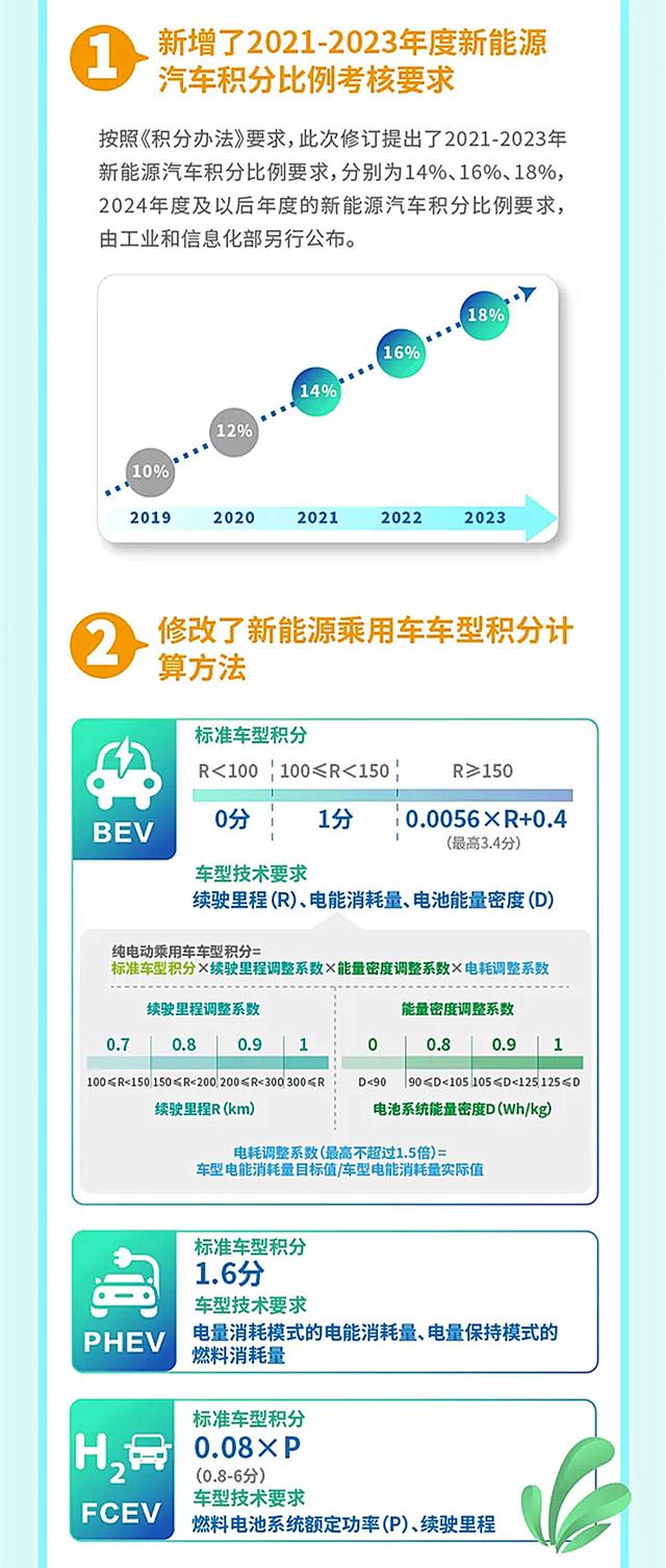 此次调整主要分为三大部分,第一部分主要针对现有条款进行了更新,首先是新增了2021-2023年度新能源汽车积分比例考核要求;其次修改了新能源乘用车车型的积分计算方法;另外更行了小规模企业油耗积分核算优惠措施。
