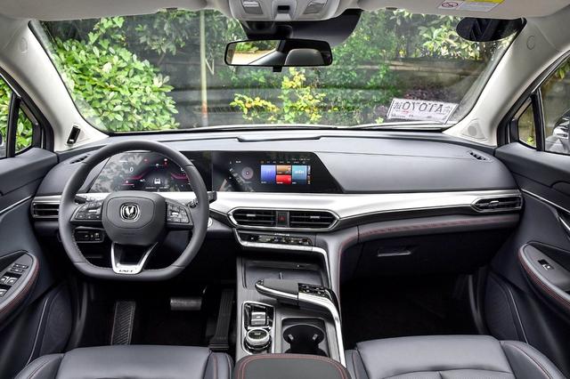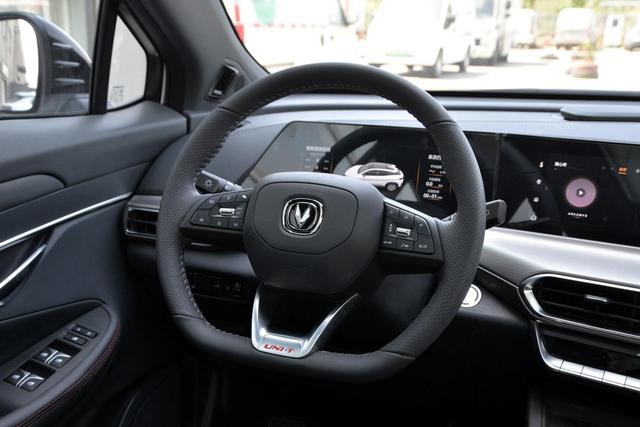 UNI-T的内饰采用了环抱式布局,车内的10.3英寸双联屏设计加上造型新颖的"太空战舰"挡把,营造出了不错的科技感,在平底方向盘和仿碳纤维饰板的装饰下显得格外运动。