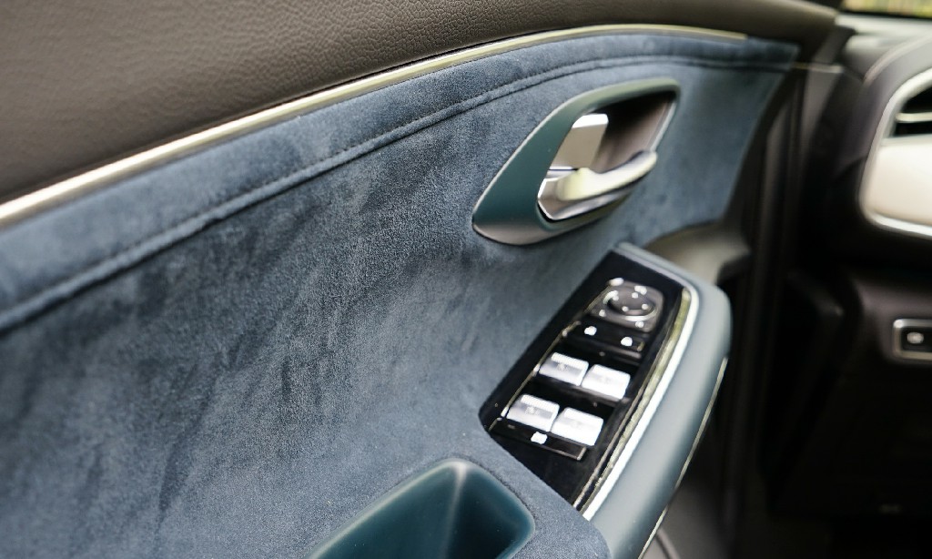 而在前后车门上则点缀了大量的翠绿色鹿皮绒材料,手枕上去舒适性不错。另外仪表台上的全贴合冷弯双曲屏幕内嵌两块12.3英寸液晶屏,给整个车厢带来了很强的科技味道。