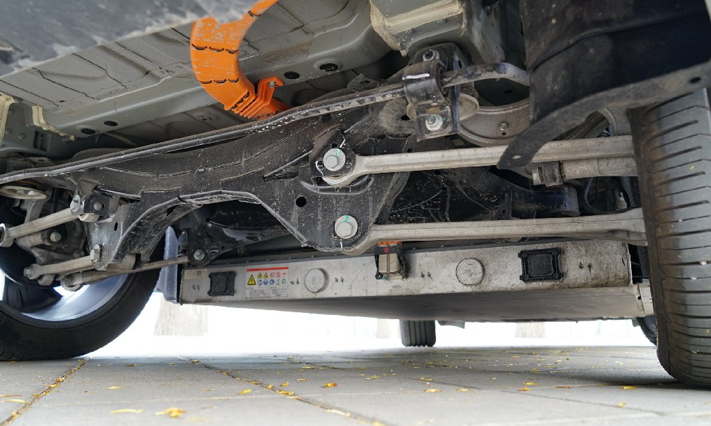 由于Aion LX 80为单电机版本,所以其底盘布局为前置前驱模式,而电池则布置在底盘正中心,能减少碰撞带来的威胁——对于广汽新能源而言,这正式GEP2.0纯电平台的最大优势所在,前后重量50:50配比均衡,电池组保护在一个框架内。