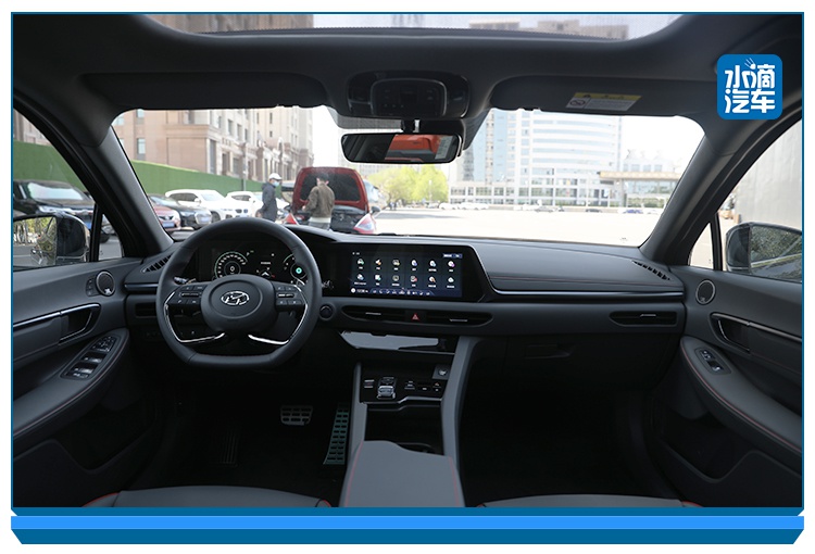 当我们将视线转移至车内,不难看出第十代索纳塔更注重营造科技感和豪华感。相比外观造型,车内设计明显柔和、温馨了许多。新车大量运用软材质包裹,提升乘坐舒适感。中控台造型偏向于驾驶员一侧,搭载全液晶仪表盘与中控屏组合的双联屏设计。