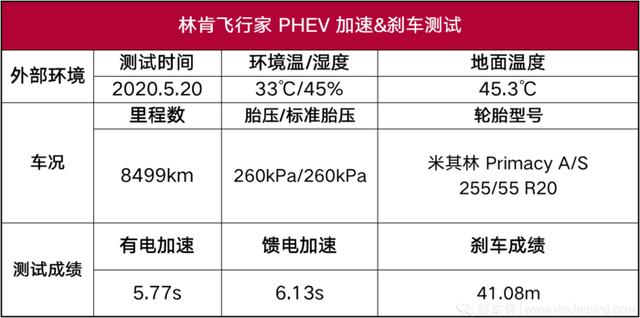 有如此水准的动力参数,性能测试是非常值得期待的。由于是混合动力车,因此我将会测试两组,分别是电量100%(表显)时和电量0%(表显)时的百公里加速成绩,测试方式都是运动模式直接地板油起步。